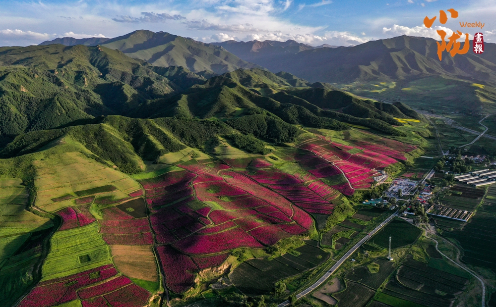 盛夏,這里高聳云天,滿山翠綠,藍(lán)天白云下,如波浪般的山坡上,金色點(diǎn)綴山谷,鮮黃映襯碧綠,玫紅耀眼奪目,將祁連山腳妝點(diǎn)的五彩斑斕。