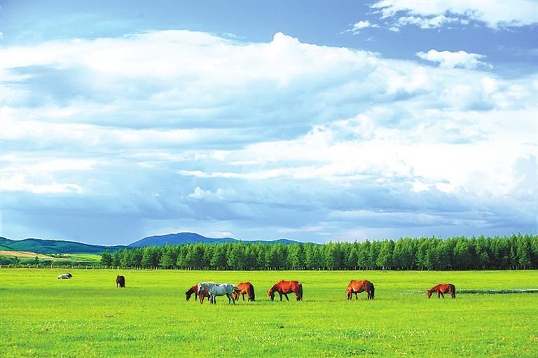 置身草原,高遠空曠的天空下面,是明凈遼闊的草場,白色的羊和黑色的牛像灑落在草叢中的白珍珠和黑珍珠,一頂頂帳篷點綴其間,不遠處,有游人騎在馬背上,優(yōu)哉游哉,或拍照或奔馳。這里一年四季景色都十分迷人:春天山花爛漫,姹紫嫣紅,如煙如夢;夏季綠草如茵,碧波浪涌,養(yǎng)心養(yǎng)眼;秋天云纏霧繞,層林盡染,美麗迷人;冬天銀裝素裹,瓊花玉樹,一派北國風(fēng)光。