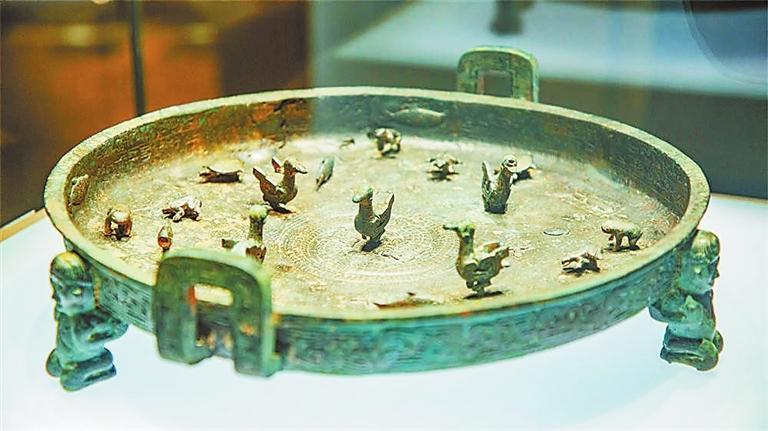 不同于大多數(shù)青銅盤,晉公盤的平底淺腹內(nèi),鑄有眾多的立體動(dòng)物雕塑。在它底部中心有一對(duì)浮雕游龍回旋盤繞,雙龍之內(nèi)站著一只水鳥,雙龍之外又有四只水鳥和四只烏龜。再向外延,又有三只青蛙和三條游魚。最外一圈,是數(shù)只青蛙和烏龜,它們或蹲或游,或者爬行,非常生動(dòng)鮮活。這些動(dòng)物的制作展示了工匠的心靈巧思,鳥喙可以自由開合,龜首能夠如意伸縮,原地還能進(jìn)行360度轉(zhuǎn)體,既體現(xiàn)了青銅冶鑄技術(shù)的高超,亦體現(xiàn)了機(jī)械制作技術(shù)的進(jìn)步。