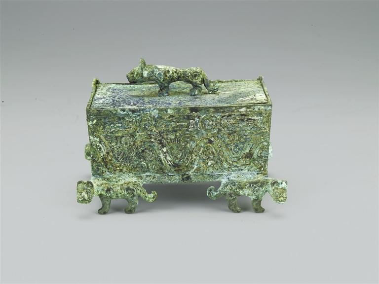 1993年山西省曲沃縣北趙村晉侯墓地62號(hào)墓出土。波曲紋虎足方盒為生活用具,出土于晉穆侯夫人墓。盒為長(zhǎng)方形,口徑略大于底徑,斜直壁,頂部有立體的虎形捉手,兩扇小蓋可以開啟,盒下有四虎為四足,虎首朝外。盒四壁上部飾鱗紋,下部飾波曲紋。此盒設(shè)計(jì)精巧,器型較小,紋飾精美,應(yīng)是古代貴族女性用來珍藏小型物件的容器。