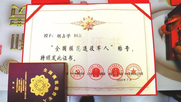 今年8月,胡占學被人力資源和社會保障部、中共中央組織部、退役軍人事務(wù)部、中央軍委政治工作部等軍地相關(guān)部門聯(lián)合授予“全國模范退役軍人”榮譽稱號,這是對退役軍人的最高榮譽和最大褒獎。