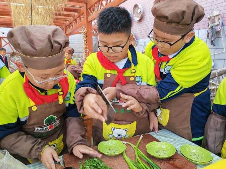 蘭州市城關(guān)區(qū)伏龍坪小學六年級1班的裴玉龍(左一)和同學們動手嘗試切蒜苗。新華社記者 白麗萍 攝