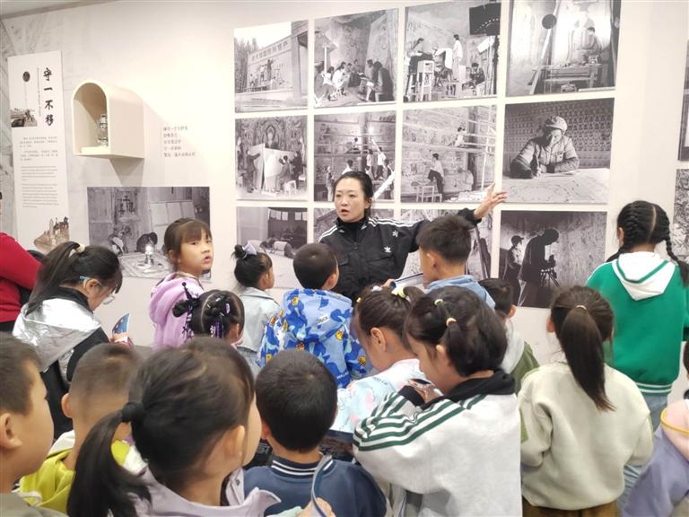 為了使小朋友們能夠身臨其境感受敦煌文化的魅力,主持人還為每一位小朋友發(fā)放了一本“敦煌小畫師”的研學手冊,并帶領(lǐng)大家前往蘭州市圖書館“近鄰”——敦煌藝術(shù)館進行了一場藝術(shù)研學之旅。在敦煌藝術(shù)館內(nèi),孩子們見證了第220號石窟的壯觀,欣賞了館內(nèi)200余件文化展品,追溯了莫高窟的歷史淵源,了解了壁畫繪制和建筑元素的藝術(shù)審美,學習了“壁上丹青”的顏料密碼。