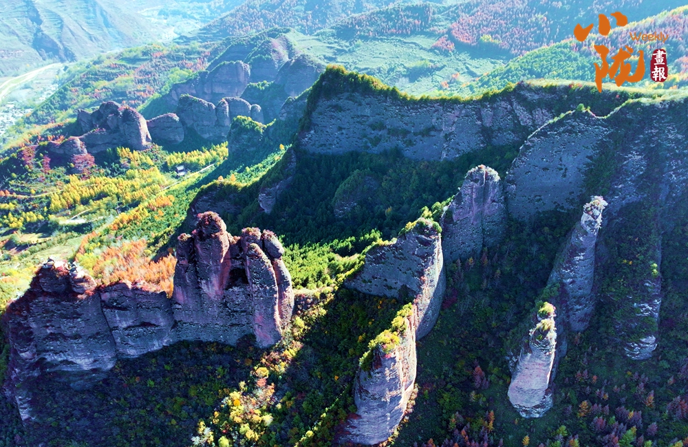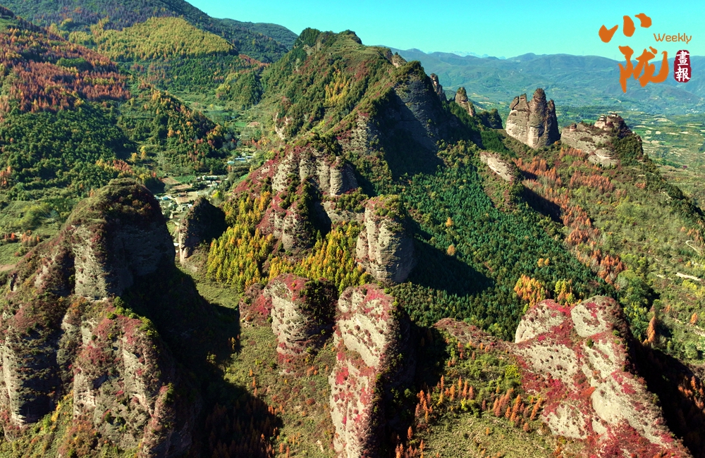 站在山頂,俯瞰四野,山勢(shì)挺拔,直插云霄,山巒被紅、黃、橙、綠各種顏色渲染,盡顯山巒疊翠之美。