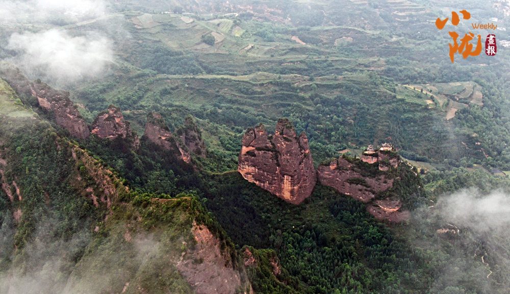從空中俯瞰,牛頭山險(xiǎn)壑錯(cuò)綜,崖高十余丈,四面凌空,直立如削,呈現(xiàn)陽剛挺拔之勢(shì)。