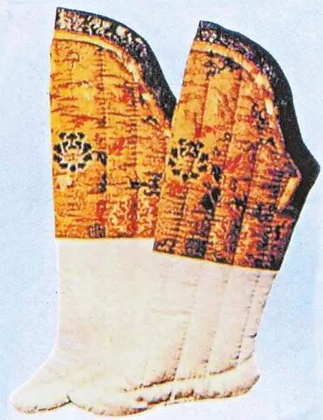 漢代的“夾襪”就是一種棉襪,這種襪子較單層襪厚實,里外兩層,故名。湖南長沙馬王堆漢墓中曾出土過兩雙夾襪,由雙層素絹縫成,襪面用絹較細,襪里用絹較粗。這是女襪,出土?xí)r放置在棺木邊箱的竹笥之內(nèi),從襪子當隨葬品來分析,那時襪子已是生活中必備衣物。