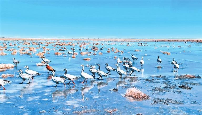 在這片濕地上,黃河的支流蜿蜒曲折,形成各式各樣的曲線。陽(yáng)光下,這些彎彎曲曲的大小沼澤,猶如一條條銀色的絲帶,閃閃發(fā)光。觸手可及的藍(lán)天白云無(wú)際無(wú)涯,像洗滌過(guò)似的,亮得耀眼,牛羊滿山坡,宛如散落在人間的珍珠。這種原始的自然美景和豐富的生態(tài)資源,讓阿萬(wàn)倉(cāng)濕地成為一個(gè)理想的旅游目的地。