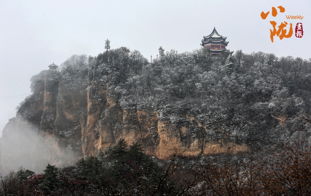 輕薄的雪花落在崆峒山巔,銀裝素裹下的樹木古剎和山下的湖泊美景分外迷人。