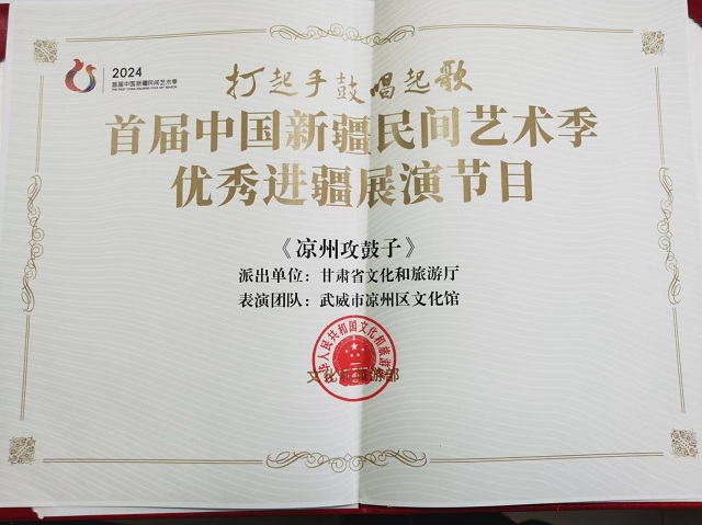 今年8月,文化和旅游部舉辦首屆中國新疆民間藝術(shù)季,《涼州攻鼓子》代表甘肅省參加首屆中國新疆民間藝術(shù)季群眾文化活動(dòng)開幕式演出,并在烏魯木齊市、石河子市進(jìn)行了多場巡回展演,其獨(dú)特的表演風(fēng)格和深厚的文化內(nèi)涵,為觀眾呈現(xiàn)了一場又一場視聽盛宴,不僅展現(xiàn)了甘肅人民的英勇與豪邁,也讓更多人領(lǐng)略到了甘肅非遺文化的非凡魅力。