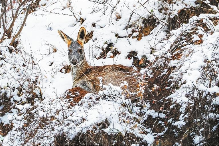 攝影師鏡頭下,一只馬麝安然臥在雪地上,它的耳朵偶爾會(huì)輕輕抖動(dòng)一下,像是在用心傾聽著風(fēng)中傳來的細(xì)微聲響。它優(yōu)美的身形與周圍的景色完美融合在一起,寧靜而祥和。