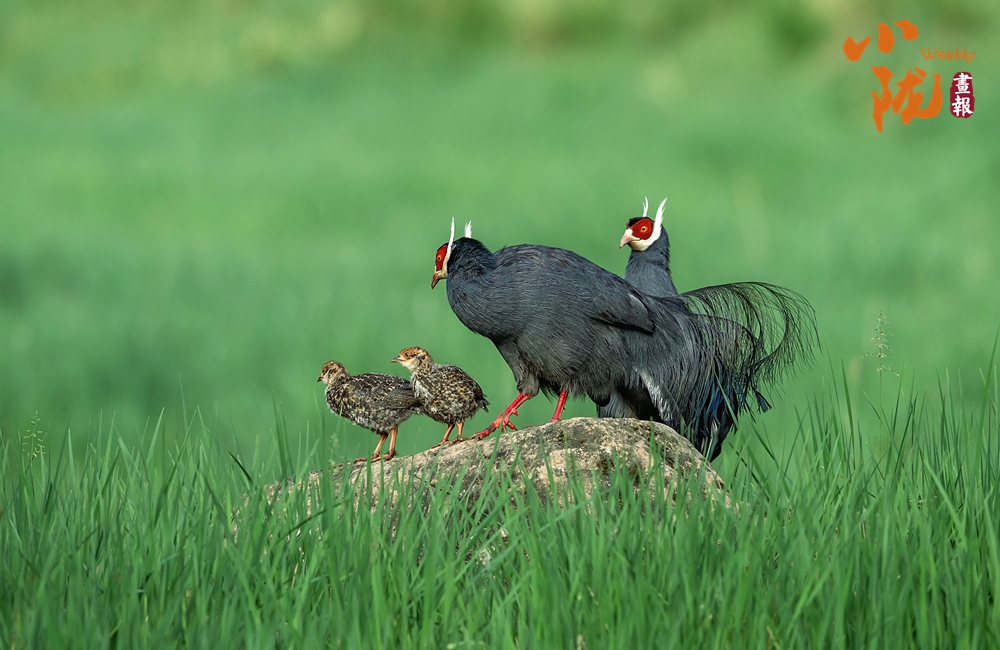 珍貴稀有的國(guó)家二級(jí)重點(diǎn)保護(hù)動(dòng)物藍(lán)馬雞,體型較大,通體藍(lán)灰色,頸項(xiàng)和肩部顏色更深,閃爍著金屬般的輝亮。其尾羽特別長(zhǎng),由灰藍(lán)色漸變?yōu)榘底纤{(lán)色,并渲染著金屬綠和金屬紫藍(lán)色,24枚尾羽中,中央一對(duì)尾羽特別長(zhǎng),富有彈性,彎曲成一個(gè)美麗的弧形,高高地翹在其他尾羽之上,披散下垂如馬尾,因而得名。此外,藍(lán)馬雞的頭側(cè)緋紅,耳羽簇白色并突出于頸部頂上,為其增添了獨(dú)特的魅力。