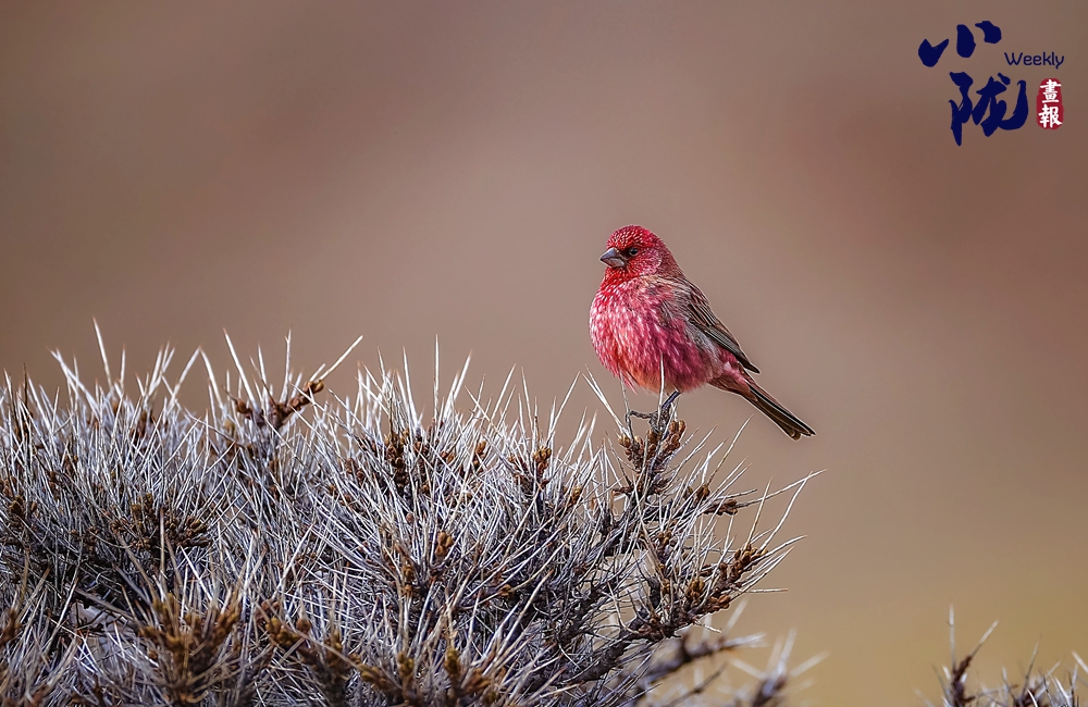 紅眉朱雀,是雀形目燕雀科朱雀屬的鳥類,中等體型,體長(zhǎng)約為15厘米。雄鳥的特征是眉紋和臉頰呈淡紫粉色,而上體則有褐色斑駁。雌鳥沒有粉色,難稱“漂亮”,它們?nèi)砘液稚?,?ldquo;朱”一點(diǎn)也不沾邊兒,實(shí)際上,很多鳥類的雌鳥都要比雄鳥暗淡很多,這種暗淡的顏色能幫助它們?cè)诜趼训臅r(shí)候更好地隱蔽,以逃過天敵的捕殺。雄鳥和雌鳥都類似于體型較小的曙紅朱雀。