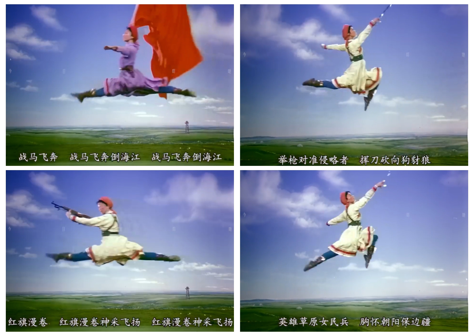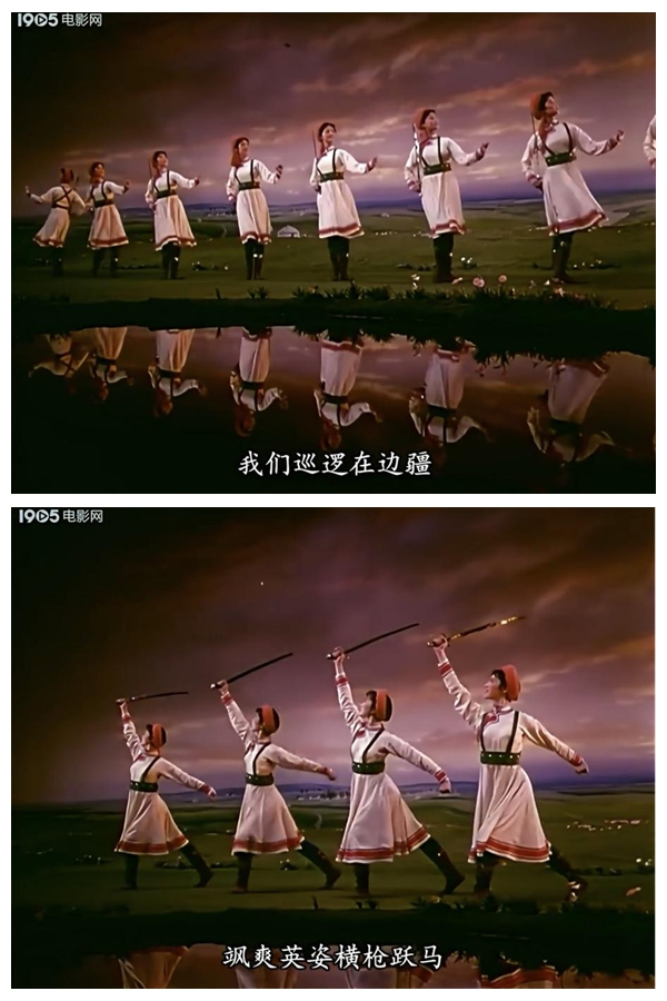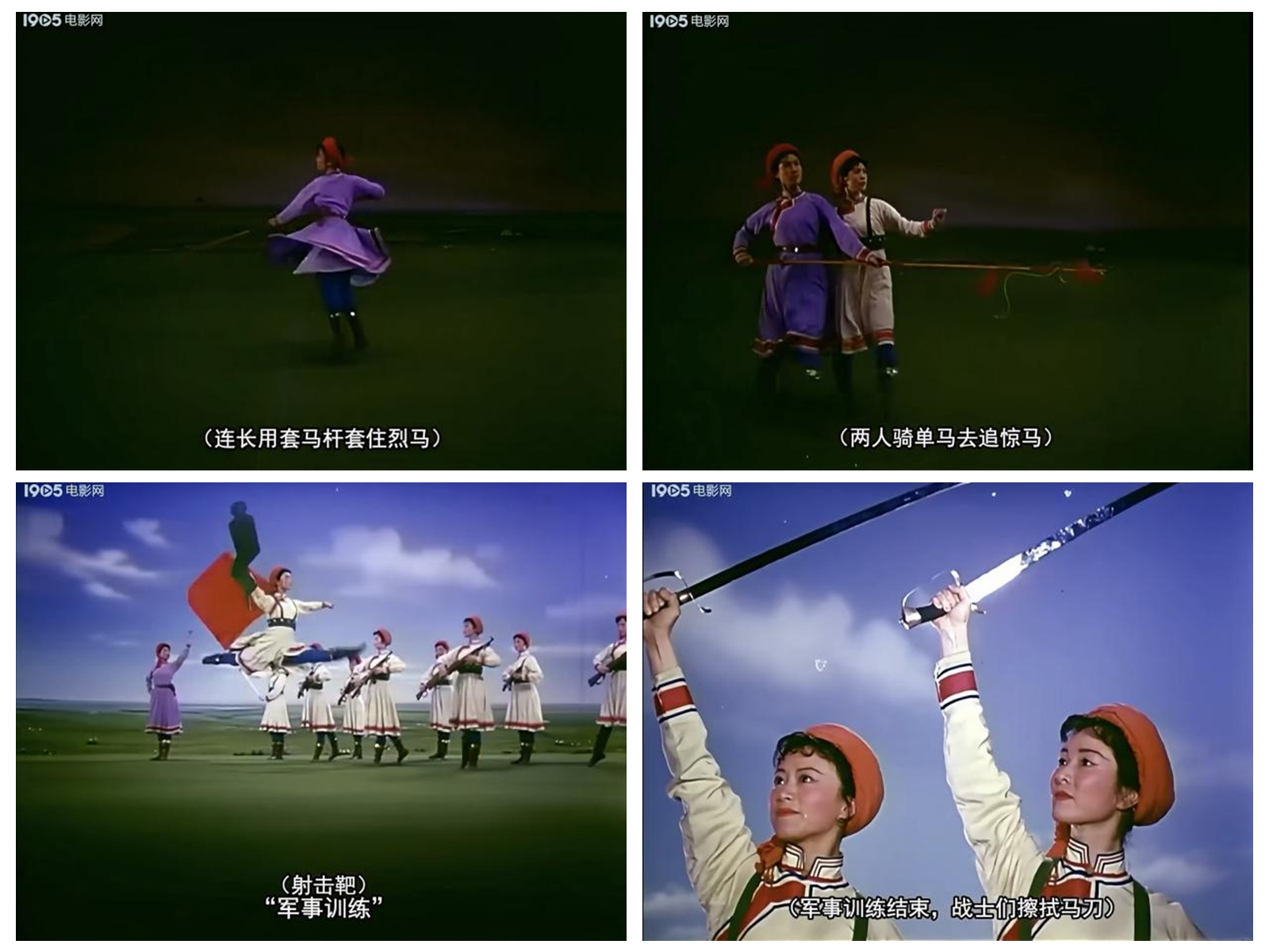 《草原女民兵》最初作為舞臺舞蹈,其美學特質(zhì)建立在現(xiàn)場性、即時性與三維空間性之上。而當它通過《百花爭艷》的鏡頭被重新詮釋時,經(jīng)歷了一場深刻的美學轉(zhuǎn)換。電影不僅記錄了這一舞蹈,更通過其特有的語言系統(tǒng),對舞蹈進行了二次創(chuàng)作與美學升華。