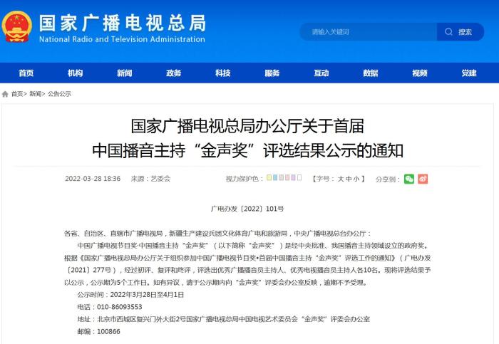 《通知》指出,根據(jù)《國家廣播電視總局辦公廳關(guān)于組織參加中國廣播電視節(jié)目獎•首屆中國播音主持“金聲獎”評選工作的通知》(廣電辦發(fā)〔2021〕277號),經(jīng)過初評、復評和終評,評選出優(yōu)秀廣播播音員主持人、優(yōu)秀電視播音員主持人各10名?,F(xiàn)將評選結(jié)果予以公示,公示期為5個工作日。