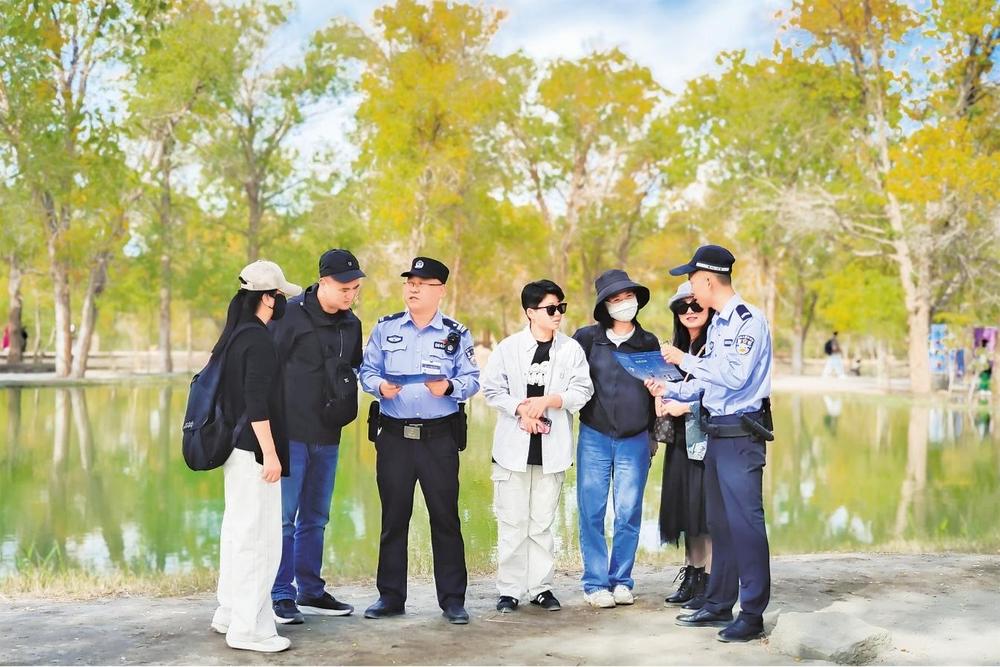 同時,運用智慧警務加強對景區(qū)人流量的動態(tài)掌握,適時調(diào)整巡防策略,在林區(qū)、夜市、游樂場等關(guān)鍵部位,民輔警利用大喇叭播報安全提示、面對面宣講等方式,有針對性開展防火防盜、交通安全、預防電詐等安全知識宣傳,向游客傳播“胡楊精神”、講好金塔故事,用“零距離”服務、全時空守護提升游客獲得感、幸福感和滿意度。