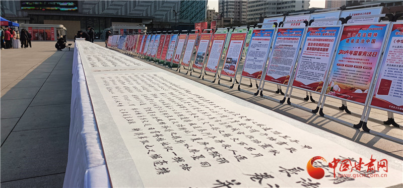 活動現(xiàn)場,省委宣傳部、省委政法委、省法院、省檢察院等20余家單位結合行業(yè)實際,宣傳憲法,普及法律知識,為群眾提供法律咨詢。為了豐富普法載體,讓群眾在互動參與中學習法律知識,活動展出了由定西市通渭縣司法局聯(lián)合書法家、師生群體、法官、檢察官、公安民警等各行各業(yè)工作人員創(chuàng)作的百米《書·法》長卷,鐫刻法治精神,書寫法律法規(guī)?,F(xiàn)場還表演了精彩的文藝節(jié)目。