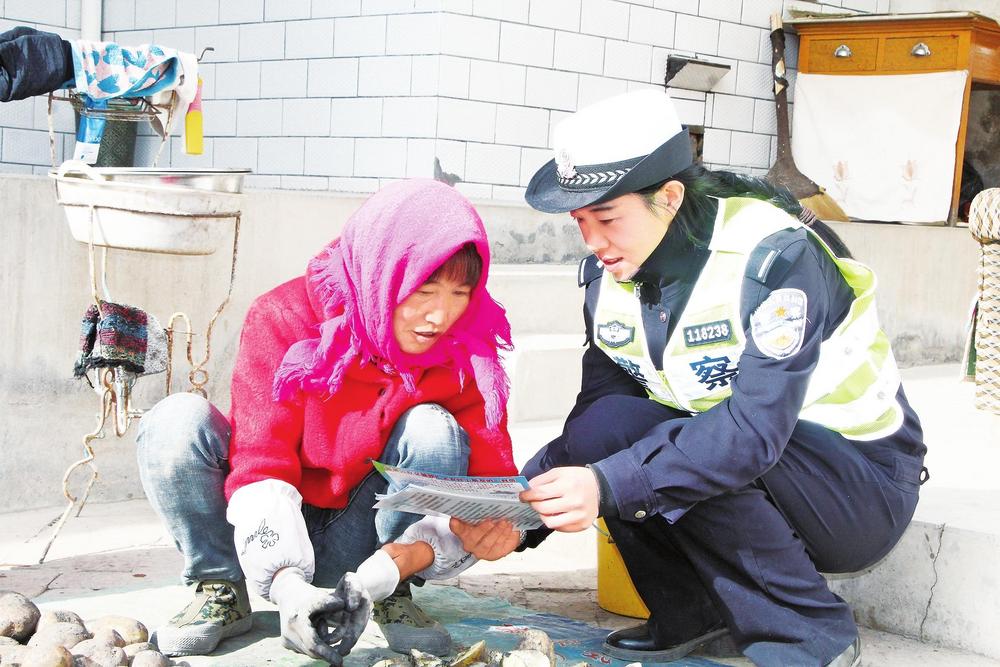 民警向群眾宣傳交通安全知識(shí)。3月10日,臨洮縣公安局交警大隊(duì)民警走村入戶(hù),開(kāi)展交通安全宣傳活動(dòng)。新甘肅·甘肅法治報(bào)通訊員楊小娟攝