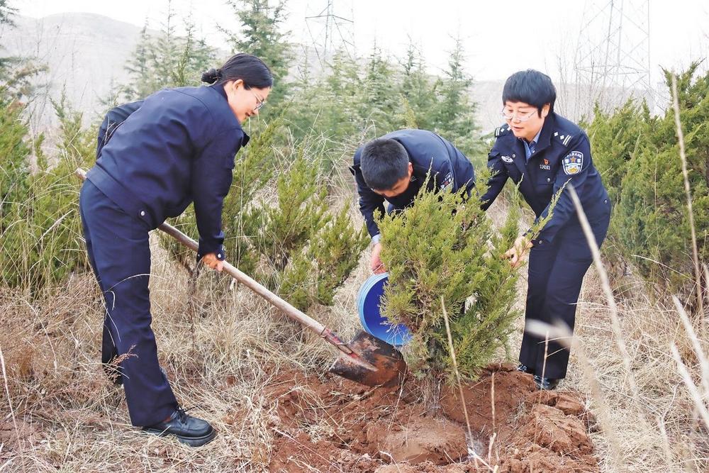 民警植樹現(xiàn)場(chǎng)。近日,隴西縣公安局開展植樹活動(dòng),民警手持鐵鍬、鋤頭,分工協(xié)作,挖坑、栽樹、培土、澆水,在指定區(qū)域種下一棵棵樹苗,為大地增添新綠。 新甘肅·甘肅法治報(bào)通訊員劉恒杰攝