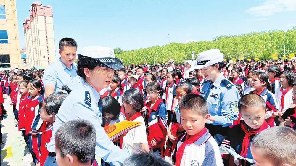 民警向?qū)W生發(fā)放宣傳資料。6月26日,積石山縣公安局交警大隊(duì)民警走進(jìn)城西小學(xué),開展“知危險(xiǎn)會避險(xiǎn)”交通安全宣傳教育活動(dòng),給學(xué)生們上了一堂暑期交通安全課。 新甘肅·甘肅法治報(bào)通訊員趙小紅攝