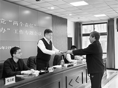 圖為河南省安陽市紀(jì)委監(jiān)委向派駐市水利局紀(jì)檢監(jiān)察組遞交2025年度全面從嚴(yán)治黨監(jiān)督責(zé)任清單,持續(xù)推動“兩個責(zé)任”走深走實。王小山 攝