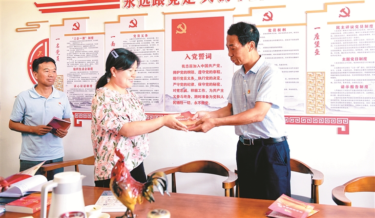 近日,安徽省宣城市宣州區(qū)紀委監(jiān)委第一黨支部來到“1+1”黨建共建村級黨支部,為村級紀檢委員送上“政治生日”賀卡。姚駿 攝