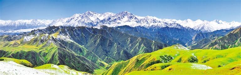初秋的祁連山,碧空如洗,遠峰疊翠。山頂的積雪在陽光照射下閃閃發(fā)光,陣陣清風拂過黃綠交錯的山林,驚起幾只飛鳥……