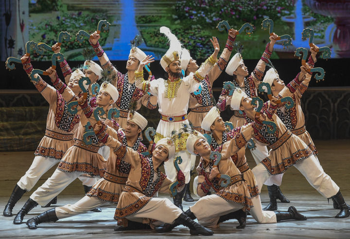 2023年1月2日,甘肅省歌舞劇院的演員在烏魯木齊京劇院表演舞劇《絲路花雨》。新華社記者 王菲 攝