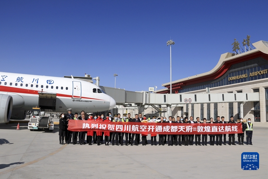 3月26日,由四川航空公司執(zhí)飛的成都至敦煌往返直達(dá)航線正式通航。這是首航航班機(jī)組人員與機(jī)場工作人員在甘肅敦煌莫高國際機(jī)場合影。新華社發(fā)(張曉亮攝)