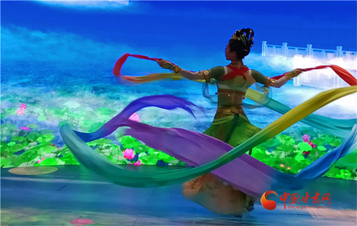 敦煌伎樂天是《絲路花雨》的經典舞姿,來自莫高窟壁畫,走進經典舞臺。在英娘手中,彩綢搖曳靈動,如婀娜的飛天,如夢幻的彩虹。