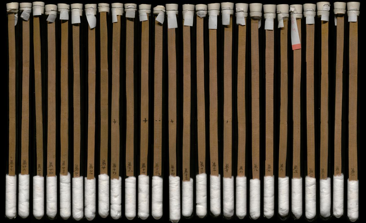 1959年,在武威市涼州區(qū)新華鄉(xiāng)磨嘴子第18號(hào)墓中,出土木簡(jiǎn)10枚,出土?xí)r懸掛于一鳩杖之上。其內(nèi)容記載了東漢永平十五年(72年)幼伯受王杖事,并錄建始二年(前31年)九月“年七十受王杖”的詔書和和平元年(前28年)毆擊王杖主當(dāng)棄市的令。由于簡(jiǎn)上無編號(hào),出土?xí)r次序已亂,史學(xué)界稱其為“王杖十簡(jiǎn)”。簡(jiǎn)長(zhǎng)23.2-23.3厘米,寬1厘米,共有240字。松木削制、兩道編繩、先書后編、墨書隸體、字跡清晰。