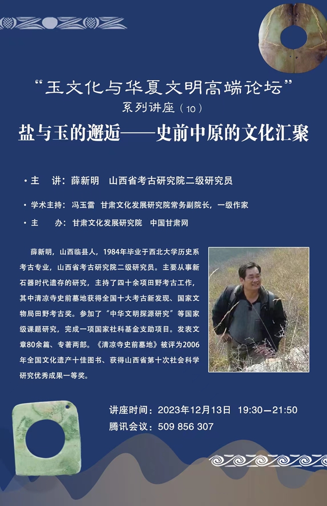 12月13日晚,山西省考古研究院二級研究員薛新明在線做了題為《玉器所見齊家文化時期甘青地區(qū)與關(guān)中地區(qū)的交流互動》的學(xué)術(shù)報告。這是甘肅文化發(fā)展研究院主辦的“玉文化與華夏文明高端論壇”系列講作活動第10講,也是今年的壓軸之講。