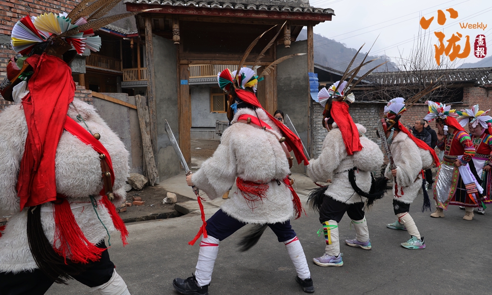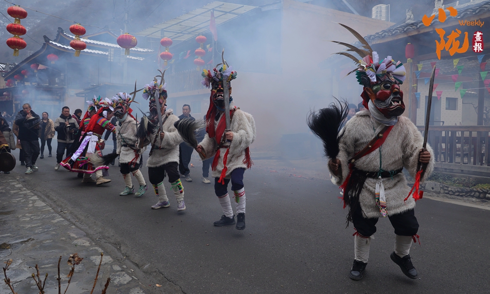 表演的隊伍圍著寨子挨家挨戶去跳,舞者至少三人,三人以上不限,皆頭戴面具,在“咚咚咚”的鼓聲和“哐哐哐”的鑼聲伴奏下激烈地跳躍,最后跳到田邊地角為止。