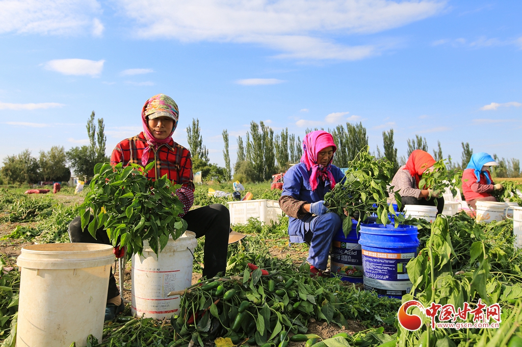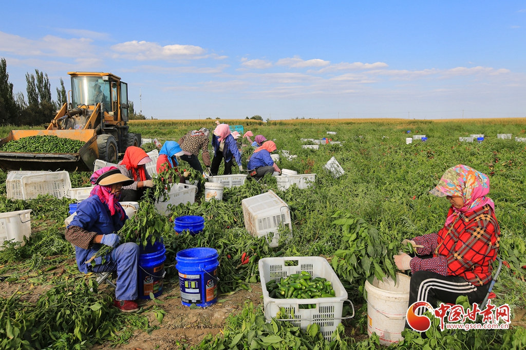 9月1日,嘉峪關(guān)市新城鎮(zhèn)長城村一農(nóng)民專業(yè)合作社種植的子彈頭辣椒喜獲豐收,種植戶搶抓農(nóng)時采摘,農(nóng)用機械車輛穿梭于田間地頭,鄉(xiāng)村田野呈現(xiàn)出一派繁忙的景象。