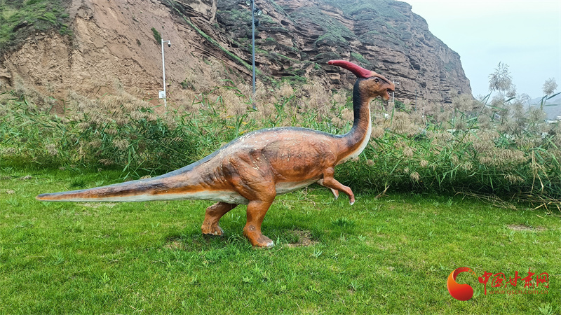 附近的山腳、水岸、草地上,不時有栩栩如生的恐龍雕塑或駐足遠眺或奔跑雀躍,仿佛穿越了時空,回到了史前世界。