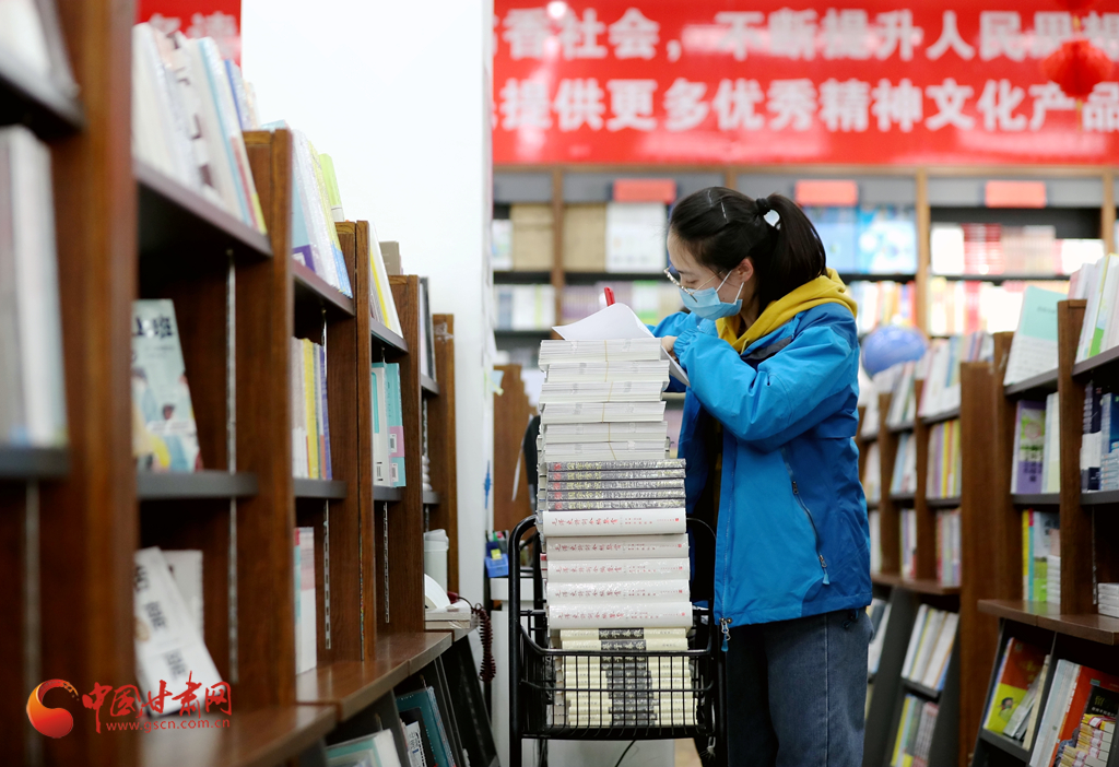 3月19日,在蘭州市西北書城,一名工作人員正在整理書籍。