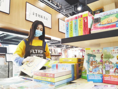 3月25日,北京外研書店東升科技園店店員在打包外賣圖書。