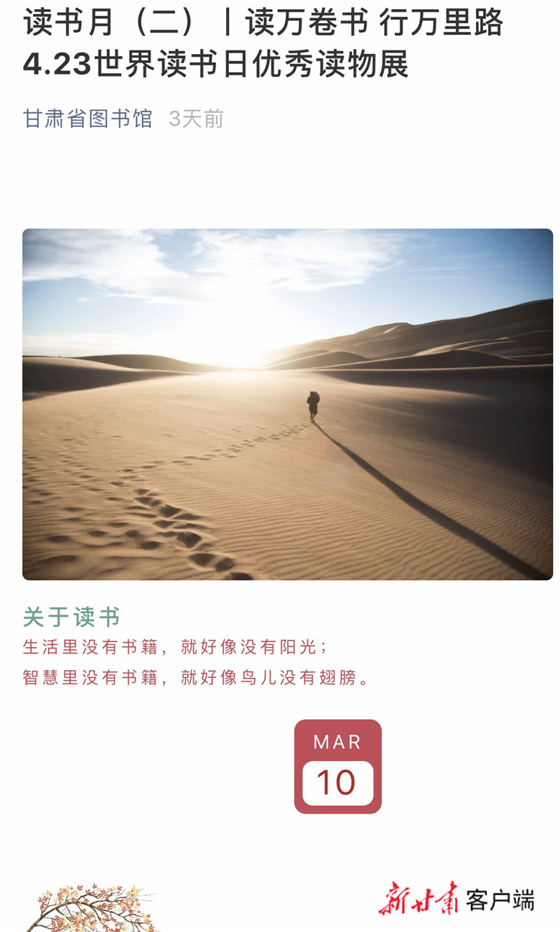 甘肅省圖書(shū)館推出線上讀書(shū)月系列活動(dòng),迎接“世界讀書(shū)日”。