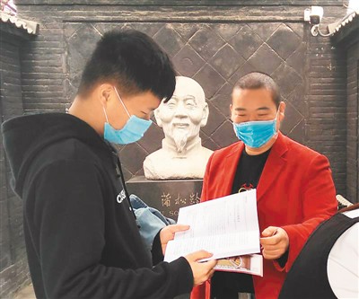 3月24日,山東省淄博市蒲松齡紀(jì)念館復(fù)工。圖為工作人員向第一批游客贈書。 曹檸薇攝