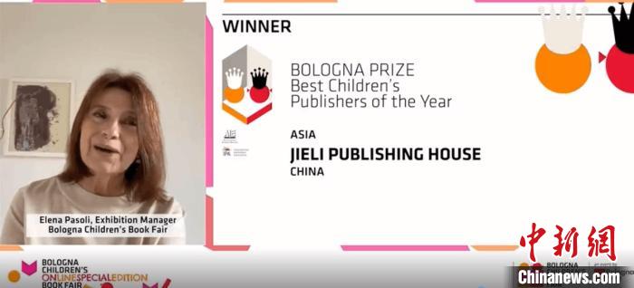 博洛尼亞童書展展覽總監(jiān)艾蓮娜?帕索里宣布2020年度最佳童書出版社大獎(jiǎng)。接力出版社供圖