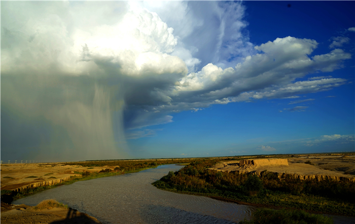 戈壁晚霞和暮鼓,疏勒河流古。聽靜水流深,百轉(zhuǎn)千回,澤潤荒原土。