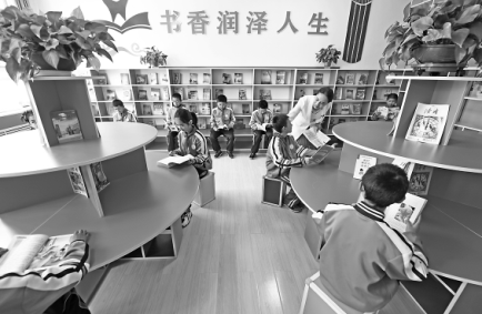 圖為5月12日,在吹麻灘小學圖書室,董彩云(后排右二)和正在閱讀的學生交流。