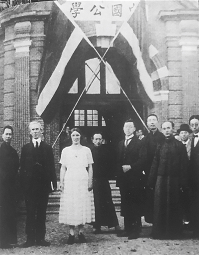 羅素(左二)與勃拉克在中國公學前合影。