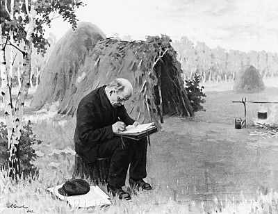 列寧在拉茲利夫湖畔匿居地寫作《國家與革命》(油畫)M.索科洛夫繪
