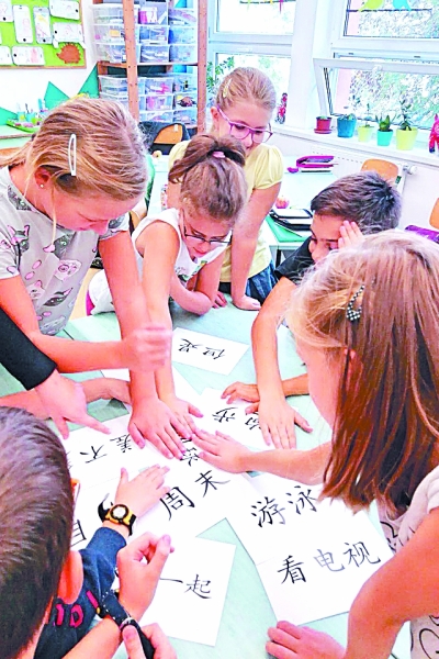 在匈牙利首都布達(dá)佩斯,匈中雙語學(xué)校的學(xué)生在課堂上復(fù)習(xí)漢語生詞。新華社發(fā)