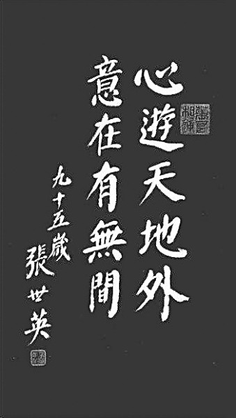 張先生的人生是圓滿的。趙樸初《遺囑》說:“生固欣然,死亦無憾?;溥€開,水流不斷。我兮何有,誰歟安息?明月清風(fēng),不勞尋覓。”弘一法師《辭世二偈》之二說:“華枝春滿,天心月圓。”這些遺言,都顯示了一種人生圓滿的喜悅。張先生書法集中的兩句話:“心游天地外,意在有無間。”同樣顯示了一種人生圓滿的喜悅。
