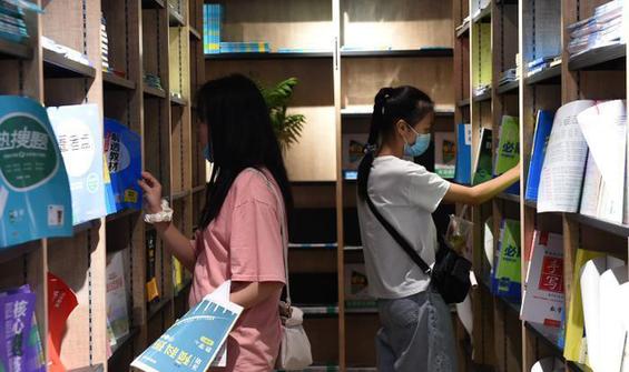 資料圖:圖為學(xué)生在書(shū)店里挑選練習(xí)題。 周毅 攝