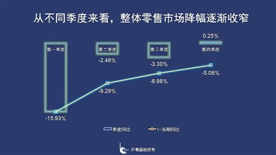 從時間軸來看,整體零售市場第一季度受疫情影響最為嚴重,同比下降15.93%,二季度復工復產復學急速收窄降幅,三季度同比下降3.3%,降幅略增,到第四季度回暖,同比出現(xiàn)小幅上漲,上升了0.25%。