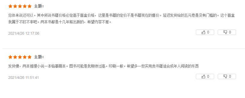 有“歐氣”讀者抽到隱藏款:“等了好久終于收到了,我收到的書都有塑封,不錯(cuò)不錯(cuò),書的豆瓣評(píng)分都在七八分左右。”“抽到了隱藏款,開心,是一套推理小說。”;也有人感到書籍不盡人意:“選書有點(diǎn)失望都是舊書的感覺,一本《餌室》,一本《紅色棺材之謎》,有點(diǎn)臟,也能接受,送的文創(chuàng)本子很好看,書袋也不錯(cuò),買兩個(gè)盲盒都是一樣的文字,不同的顏色,這個(gè)有點(diǎn)可惜了。”“發(fā)貨慢,兩本推理小說一本臨摹畫本。圖書可能是我期待過高,印刷一般。”