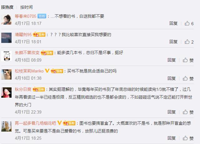 此前,部分網(wǎng)友在中新經(jīng)緯微博評(píng)論對(duì)“圖書盲盒”現(xiàn)象開展討論。有網(wǎng)友提到,“其實(shí)挺理解的,畢竟每年買的書到了年底總結(jié)的時(shí)候能讀完1/3就不錯(cuò)了,過幾年再看讀過一半已經(jīng)是極限,反正精挑細(xì)選的也不是都會(huì)讀的,不如碰碰運(yùn)氣說不定還能打開新世界的大門。”也有網(wǎng)友認(rèn)為,“不想看的書,白送我都不要”“買書不就是挑合適自己的嗎”等等。