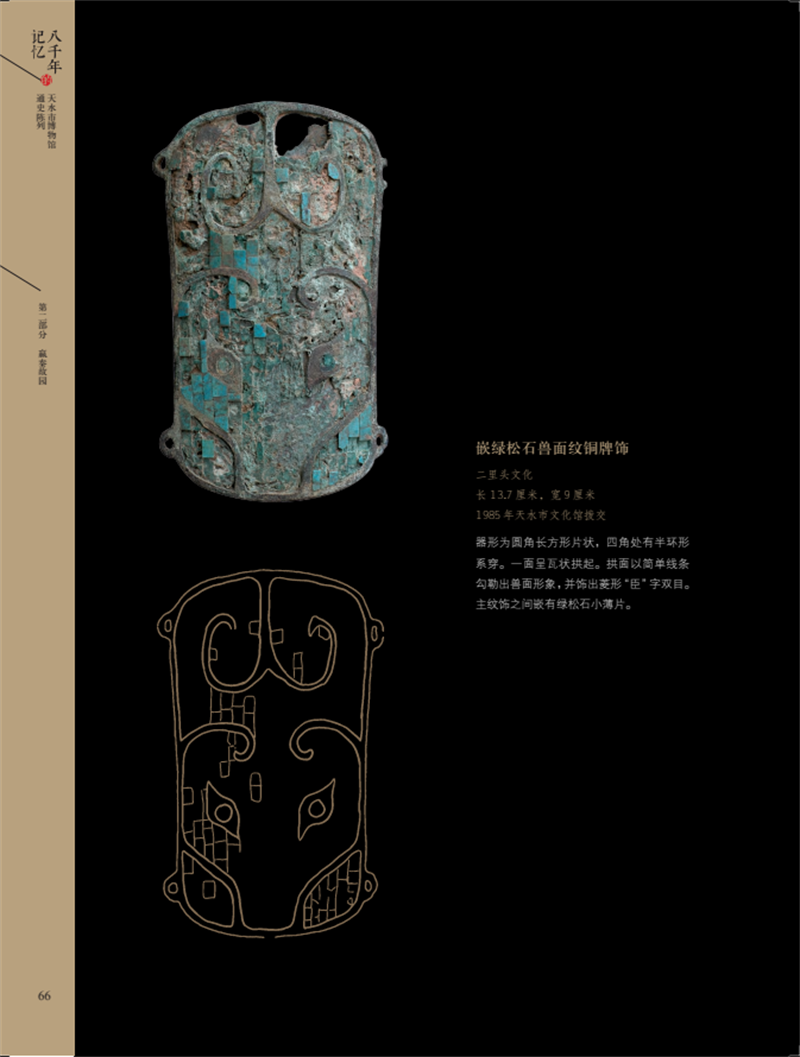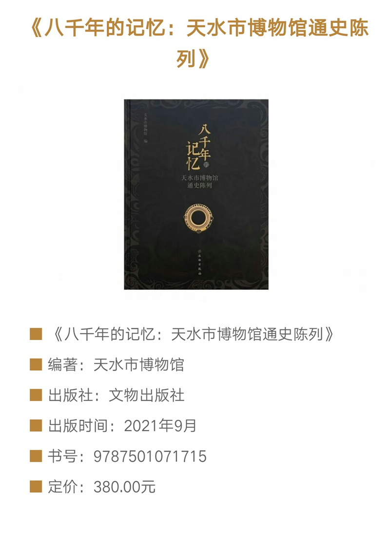 《八千年的記憶——天水市博物館通史陳列》圖錄,是在2018年天水市博物館通史陳列展覽提升改造基礎上提煉而成,以天水市博物館能夠反映天水歷史文化面貌的館藏精品文物為重點,輔之以天水地區(qū)出土的藏于其他文物機構的重點文物,旨在展示天水八千年歷史文脈和文明成就。全書共分為文明曙光、嬴秦故園、兩漢物華、魏蜀兵戈、渭水梵音、隋唐盛景、茶馬大市、古城遺韻8個部分,擷集天水文物精粹,在展現天水自舊石器時代至明清時期完整歷史序列的同時,突出了獨具天水特色的歷史文化資源。
